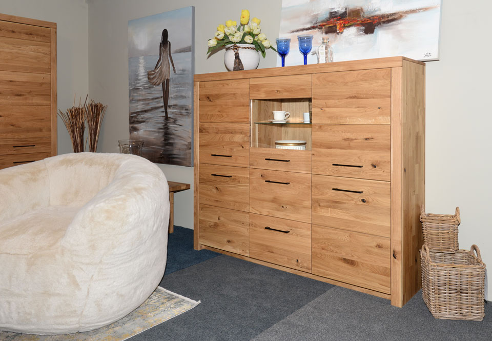 Die Modellpalette umfasst Vitrinen, High- und Sideboards, praktische TV- Boards sowie Wandborde.